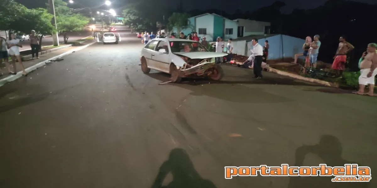 Imagens de câmeras de segurança em uma loja registraram na noite de ontem o acidente que envolveu uma Zafira e um Gol na Avenida Paraná na esquina com a rua Flor de Maracujá.