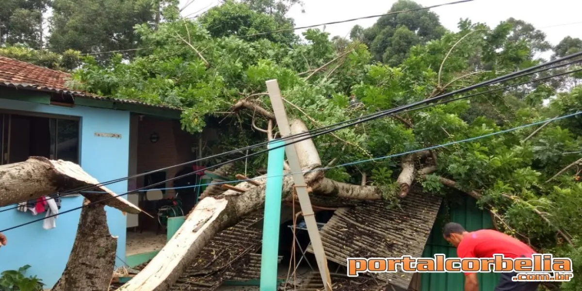 No local, a árvore havia caído sobre uma construção anexa a uma residência que precisou da ação da equipe para fazer o corte e retirada da mesma.
