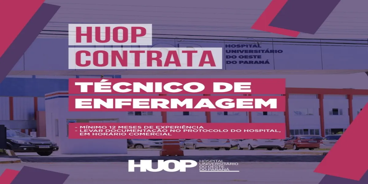 Hospital Universitário do Oeste do Paraná (Huop) está com chamamento público aberto para contratação de técnicos de enfermagem. Os profissionais devem ter no mínimo 12 meses de experiência.