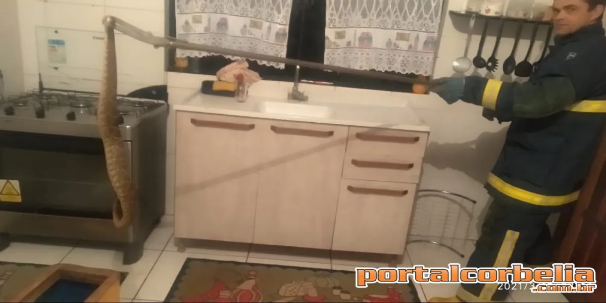 Chegando ao local, foi constatado ser uma cobra cascavel de médio porte que estava na cozinha de uma residência.