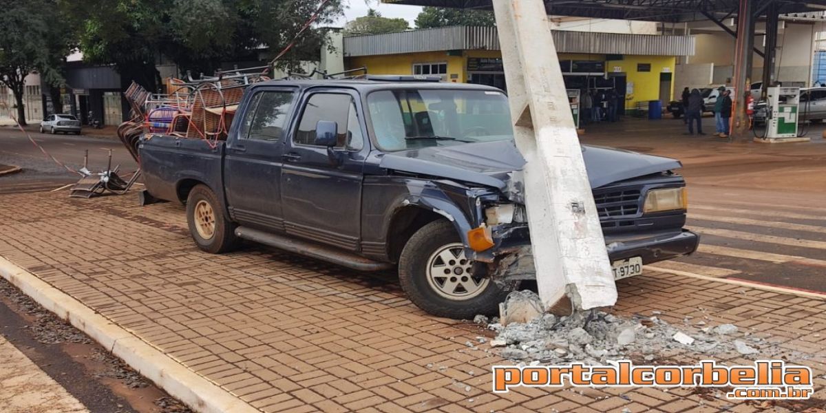 Um veículo D20 que seguia pela Avenida São Paulo colidiu contra um poste de iluminação pública quando tentava acessar a Avenida Espírito Santo em Corbélia.