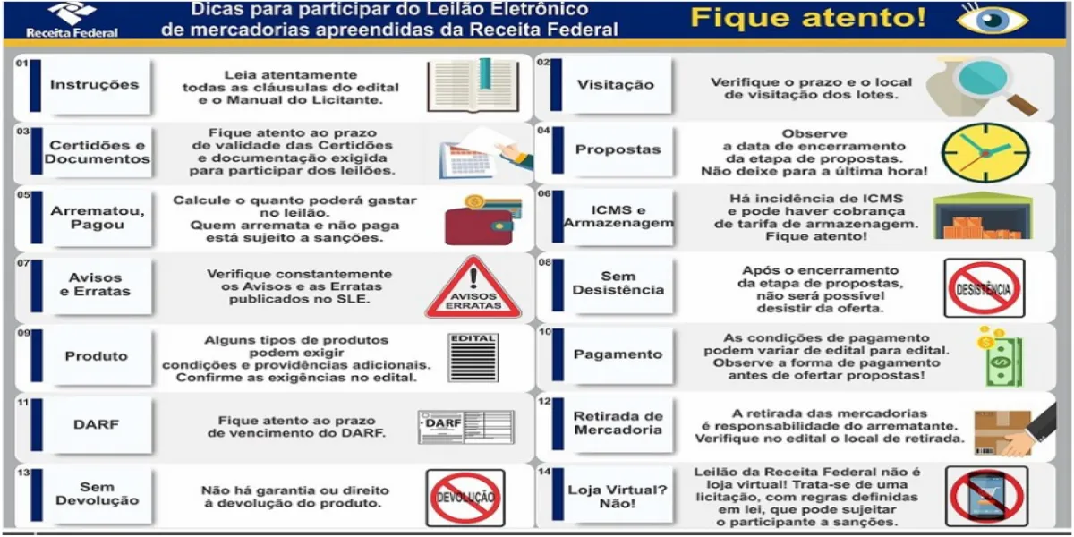 Importante destacar que o pagamento pelas mercadorias arrematadas em leilão é feito por meio de Documento de Arrecadação de Receitas Federais (Darf) e nunca mediante depósitos ou transferências para contas de terceiros.