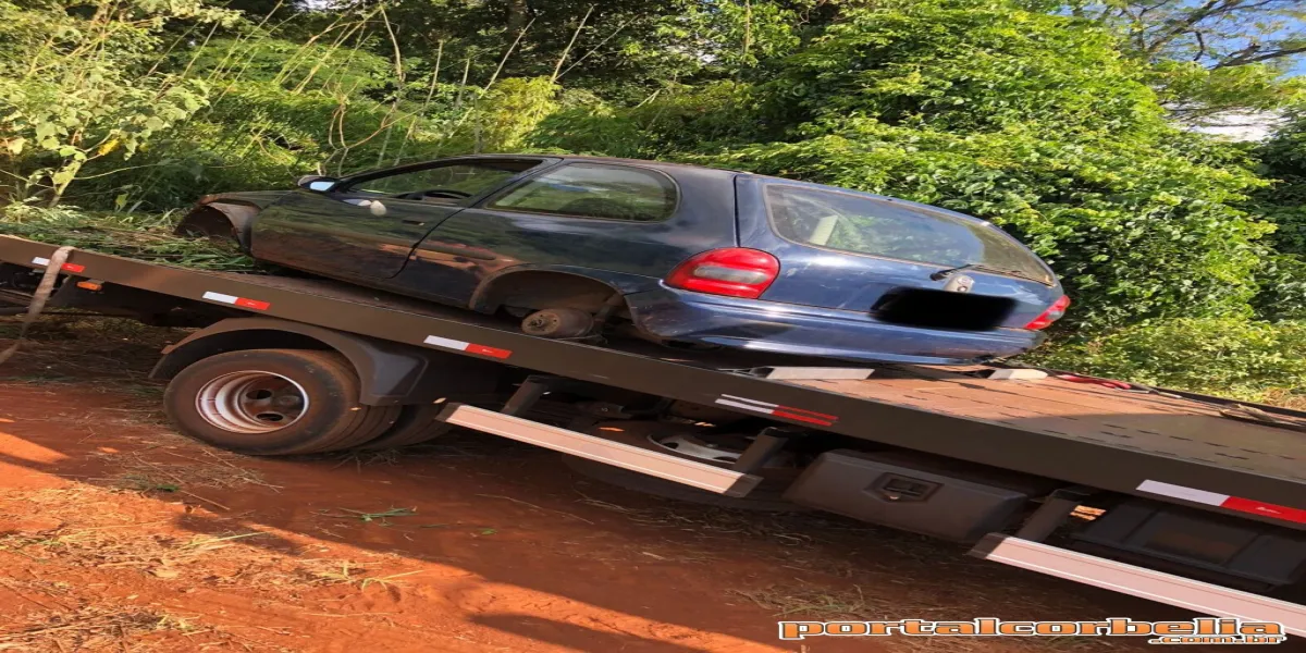 O que restou do veiculo estava escondido em meio a uma mata fechada no interior do município de Corbélia e foi necessário apoio de de produtores rural com um trator para a retirada do veículo que estava sem as rodas, capô e paralamas.