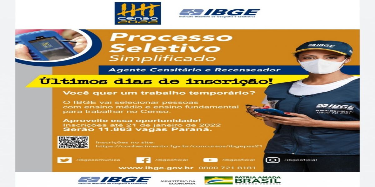 Terminam amanhâ (21) as inscrições para o processo seletivo do Censo Demográfico 2022 com vagas para recenseador e agente censitário