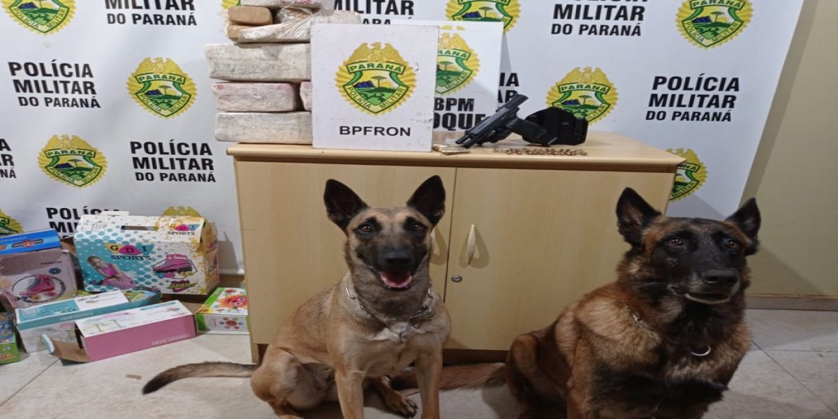 Na madrugada de domingo (20/02) policiais militares do Pelotão de Operações com Cães do BPFRON - Batalhão de Polícia de Fronteira patrulhavam a BR369, cidade de Corbélia-PR, durante Operação Hórus, quando abordaram um ônibus que teria destino a cidade de São Paulo. -SP. Os cães de faro do BPFRON indicaram a presença de ilícitos em três bagagens. Nelas foram encontrados tabletes de substância análoga a maconha totalizando 27,400 kg, um pistola, 50 munições e um coldre em meio a brinquedos que estavam nas malas. A passageira proprietária das bagagens foi detida e encaminhada com os materiais apreendidos para a delegacia da Polícia Civil de Cascavel-PR.