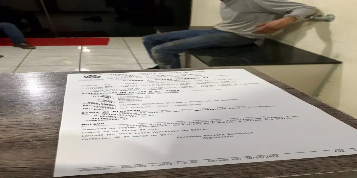 Diante da atitude suspeita foi realizada abordagem e constatado um mandado de prisão em seu desfavor com pena de 5 anos e 4 meses pelo crime do art. 157: Roubo.