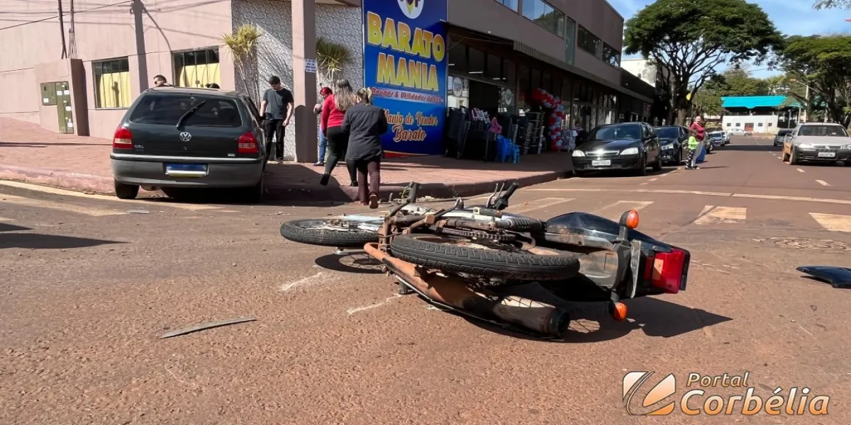 Uma colisão envolvendo um veículo Gol e uma motocicleta foi registrada no final da manhã deste sábado por volta das 11h00 na avenida São Paulo na esquina com a avenida Minas Gerais em Corbélia.