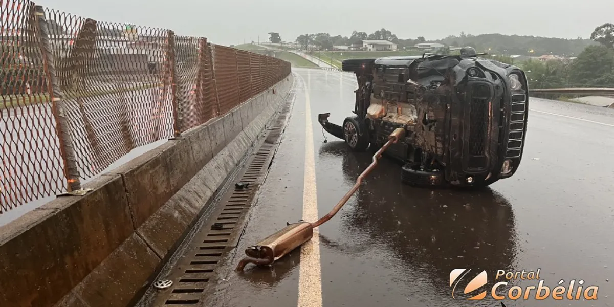 Um veículo Jeep Renegade capotou após atingir o guard’rail na lateral da pista no final da tarde desta quinta-feira na BR369 na área urbana de Corbélia.