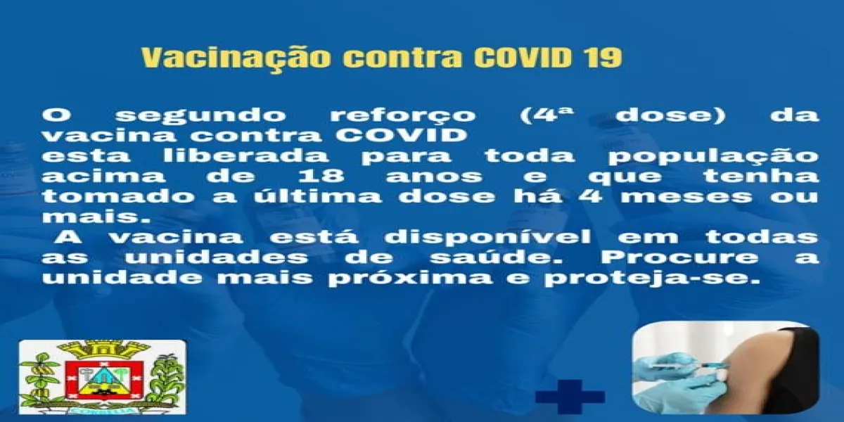 O segundo reforço (4ª dose) da vacina contra a Covid está liberado para toda população acima de 18 anos e que tenha tomado a última dose há 4 meses ou mais.