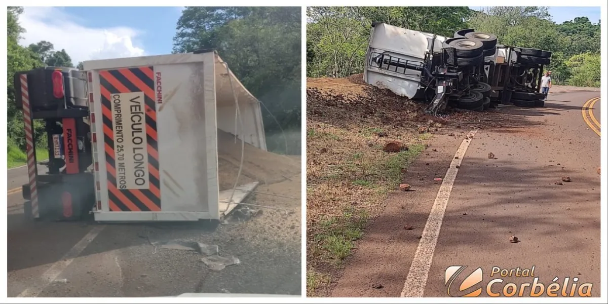 O veículo transportava grãos que ficaram esparramados na lateral da pista.