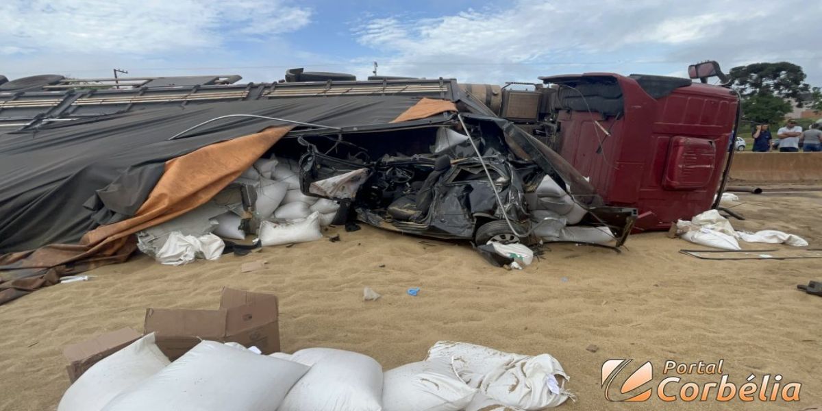 um outro caminhão acabou atingindo o reboque de um gol, que ficou na pista e posteriormente a carreta ao tentar desviar atingiu a mureta de proteção vindo a tombar sobre um celta que ficou embaixo da carga. Após mais um veículo ainda colidiu na traseira da carreta tombada.