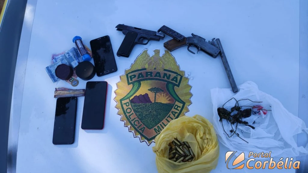 Mais munições das referidas armas foram localizadas em uma sacola plástica. Em busca a outros cômodos da residência, foram encontrados uma quantia de substância análoga a maconha em um invólucro plástico, que pesou aproximadamente dez gr (10 gramas) e três pequenos invólucros de papel alumínio contendo entorpecente análogo ao crack, pesando aproximadamente nove gr (9 gramas). No mesmo móvel havia três aparelhos celulares. Diante dos fatos, foi dada voz de prisão aos abordados, cumprido o já mencionado mandado de prisão, e encaminhados juntamente com as armas, drogas ilícitas e materiais apreendidos para a Delegacia de Polícia Civil de Nova Aurora para as medidas cabíveis.
