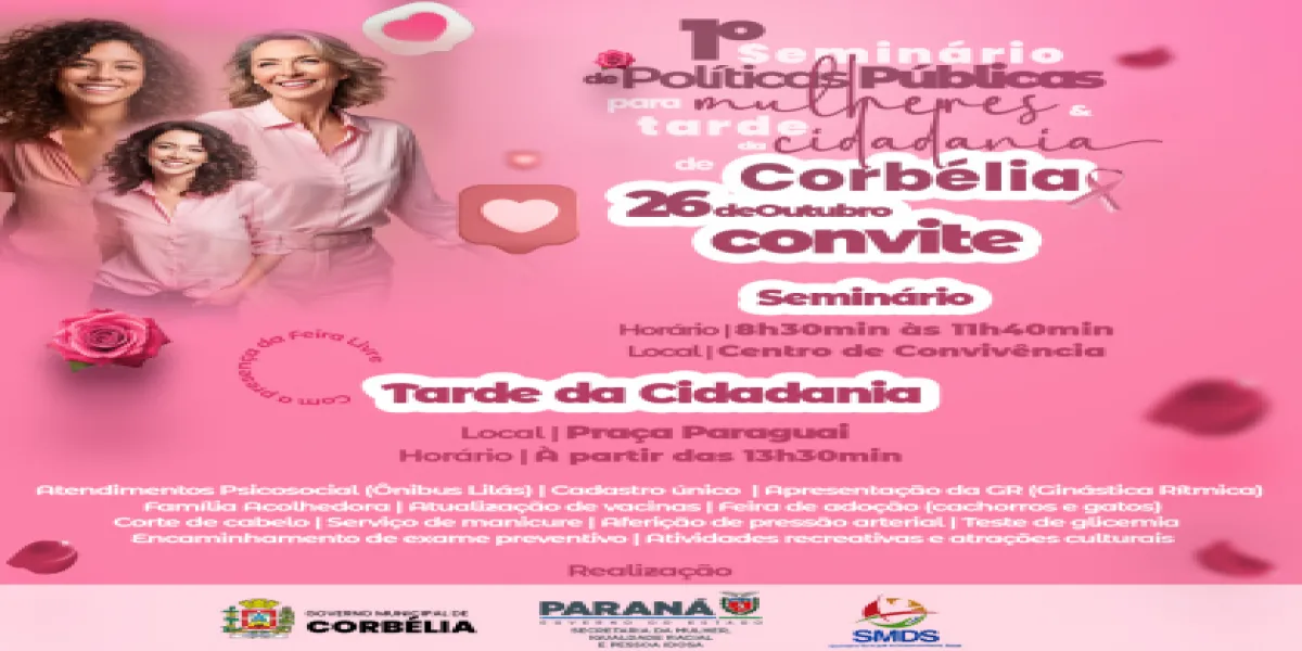 No próximo dia 26 de outubro, Corbélia realiza o I Seminário De Políticas Públicas Para Mulheres e Tarde Da Cidadania. O evento promovido pelo Município de Corbélia e SEMIPI - Secretaria de Estado da Mulher, Igualdade Racial e Pessoa Idosa, está sendo organizado pela Secretaria Municipal de Desenvolvimento Social, e promete dedicar o dia às mulheres.