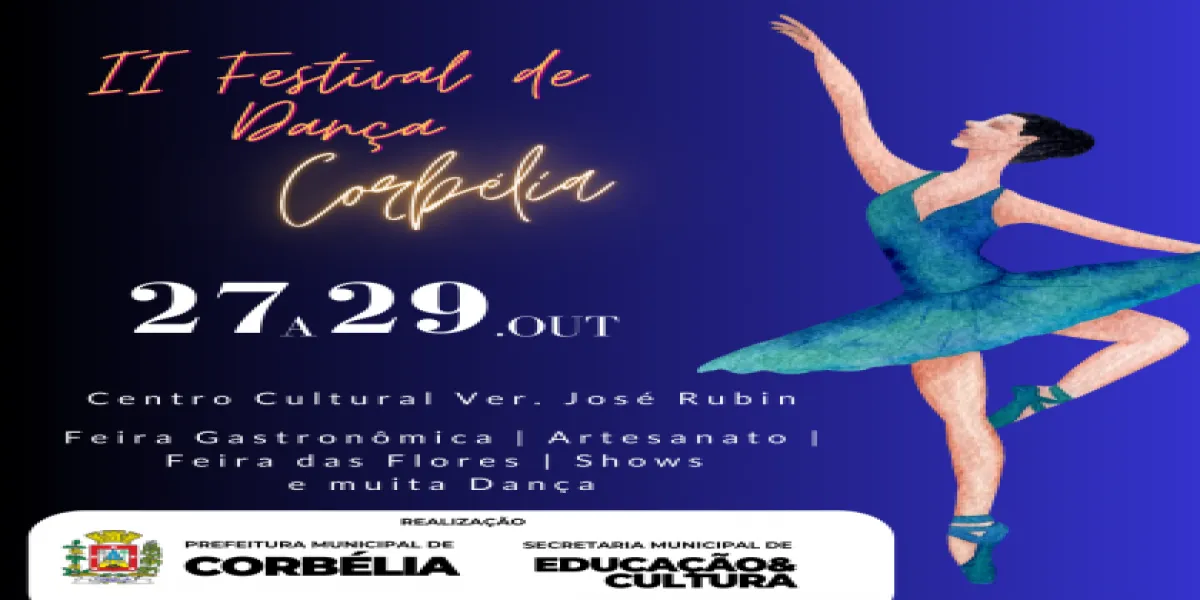 Entre os dias 27 e 29 de outubro Corbélia realiza seu II Festival de Dança. Organizado pela Secretaria Municipal de Educação e Cultura, o evento promete uma extensa programação variada e eclética que promete agradar todos os públicos.