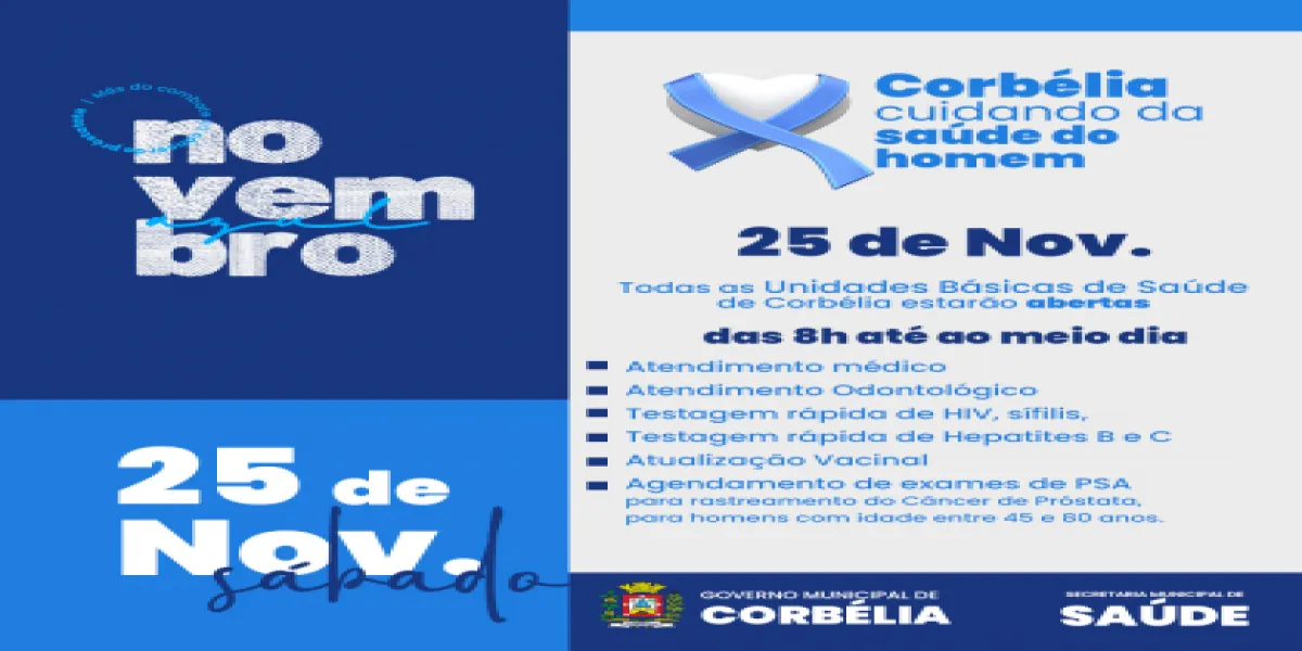 No próximo sábado, 25 de novembro, todas as Unidades Básicas de Saúde (UBSs) em Corbélia estarão dedicadas a promover a saúde masculina como parte das ações da campanha Novembro Azul, organizada pela Secretaria Municipal de Saúde. Essa iniciativa ocorrerá durante a manhã, das 8h ao meio-dia.