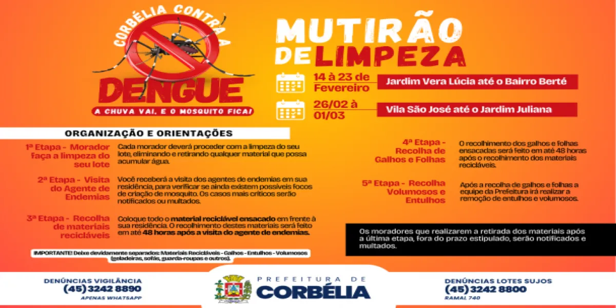 O mutirão de limpeza contra a dengue reunirá servidores das Secretaria de Saúde, Obras e Urbanismo, Agricultura e Desenvolvimento Econômico do Município de Corbélia. A ação acontece em caráter EXCEPCIONAL.