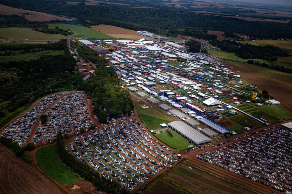 Do alto é possível ver a dimensão do parque do Show Rural e todas as 17 mil vagas de estacionamento tomadas