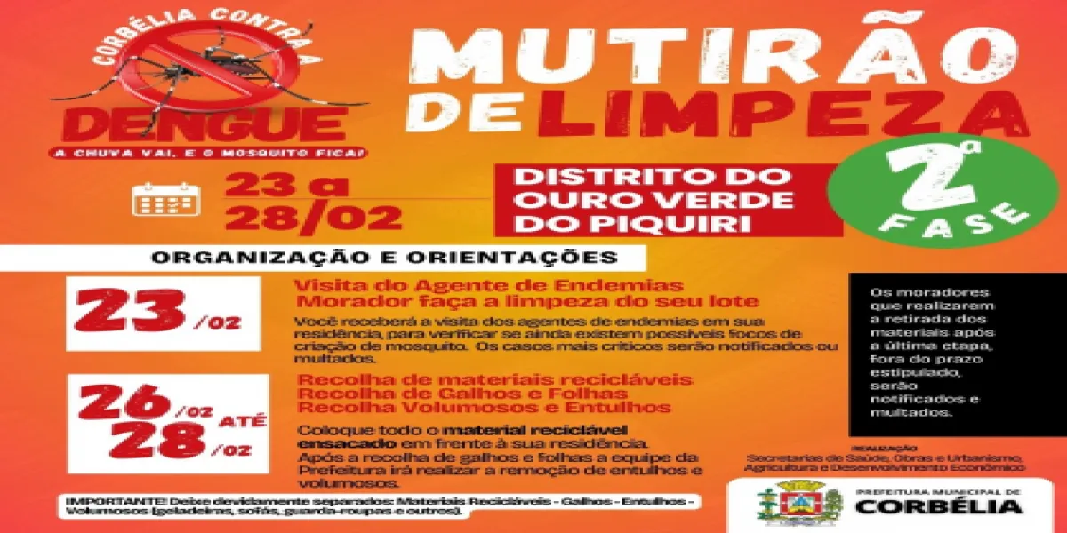 Os moradores do Distrito do Ouro Verde do Piquiri devem ficar atentos para receber os agentes de endemias e agentes de saúde neste sexta-feira, 23. A Secretaria Municipal de Saúde de Corbélia, com Secretaria de Obras e Urbanismo, Secretaria de Indústria e Comércio e Secretaria de Agricultura, dão início nesta sexta-feira, 23, a segunda fase do Mutirão de limpeza.