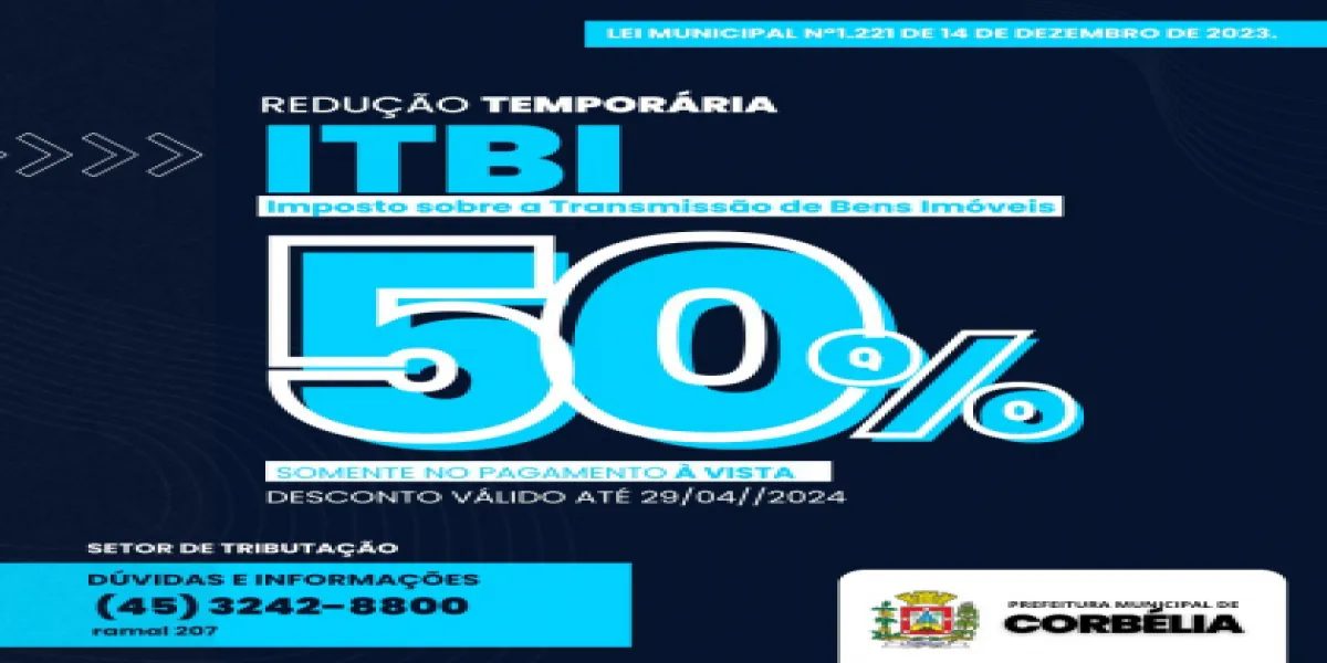 O prefeito de Corbélia, Dr. Giovani Miguel Wolf Hnatuw, prorrogou a Lei nº 1.221, que autoriza a redução temporária da alíquota do Imposto sobre a Transmissão de Bens Imóveis (ITBI). Com a prorrogação, o benefício com desconto de 50% permanece válido até o dia 29 de Abril de 2024.