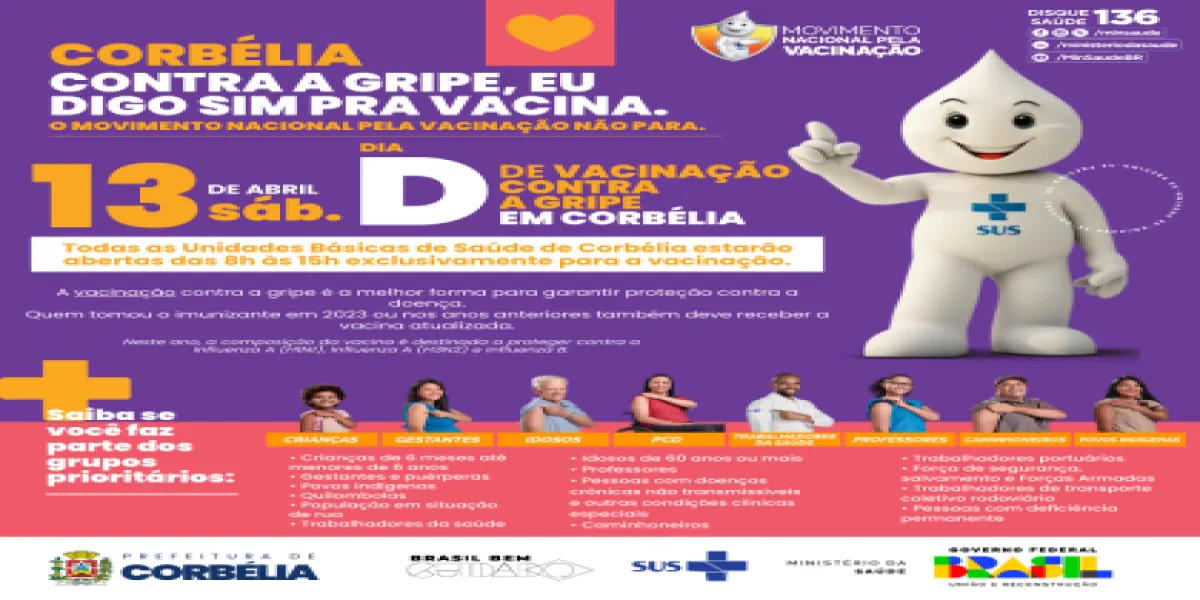 Diante da proximidade do inverno e da necessidade de proteger a população contra a gripe, as autoridades de saúde de Corbélia fazem um chamado urgente para que todos os grupos prioritários compareçam neste sábado às UBSs para receber a vacina e garantir sua proteção contra a influenza.