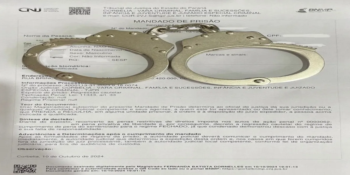 Na tarde desta segunda-feira (14/10), a Polícia Civil de Corbélia cumpriu um mandado de prisão pelo crime de tráfico de drogas, emitido pela Vara Criminal de Corbélia no dia 10 de outubro. O indivíduo, um homem de 28 anos, foi detido em sua residência, após investigações que confirmaram seu envolvimento em atividades ilícitas relacionadas ao tráfico de entorpecentes na região.