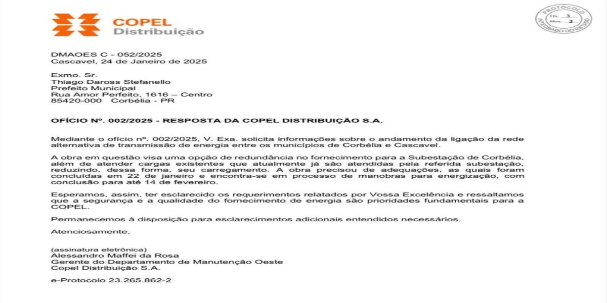 A Copel informou ao prefeito de Corbélia, Thiago Stefanello, que a ativação da nova rede de transmissão de energia na cidade foi adiada para fevereiro. A obra, que se estende de Cascavel a Corbélia, havia sido prometida para dezembro de 2024, mas necessitou de ajustes que foram concluídos no dia 22 de janeiro.