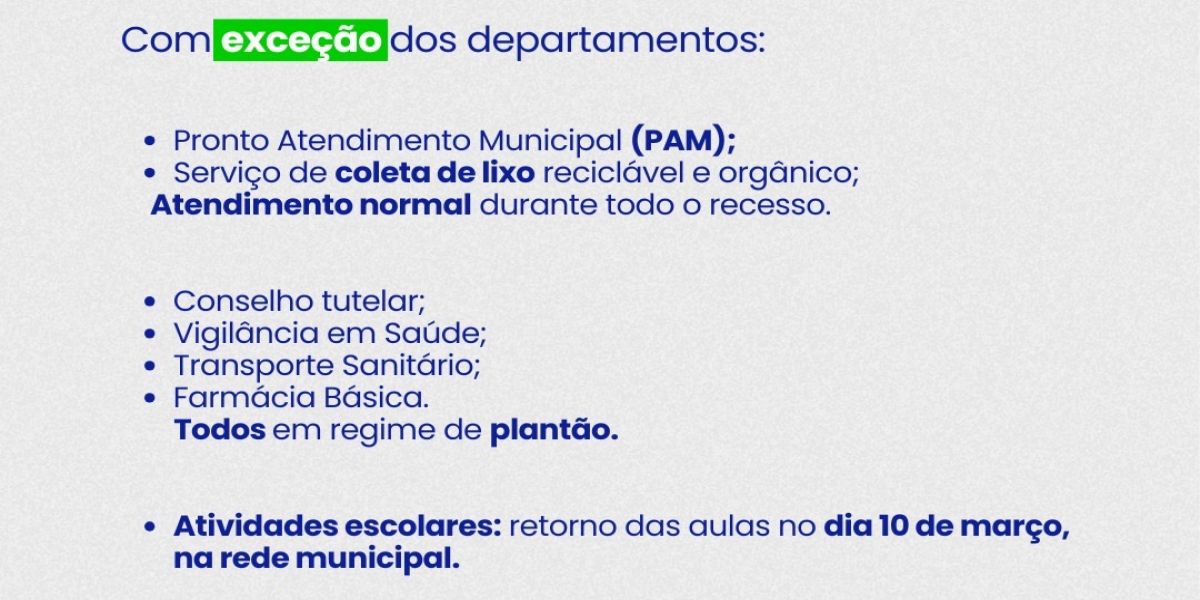 As escolas municipais estarão em recesso de 03 a 05 de março. Nos dias 06 e 07, os professores participarão de atividades de formação pedagógica, e as aulas serão retomadas na segunda-feira, dia 10 de março.