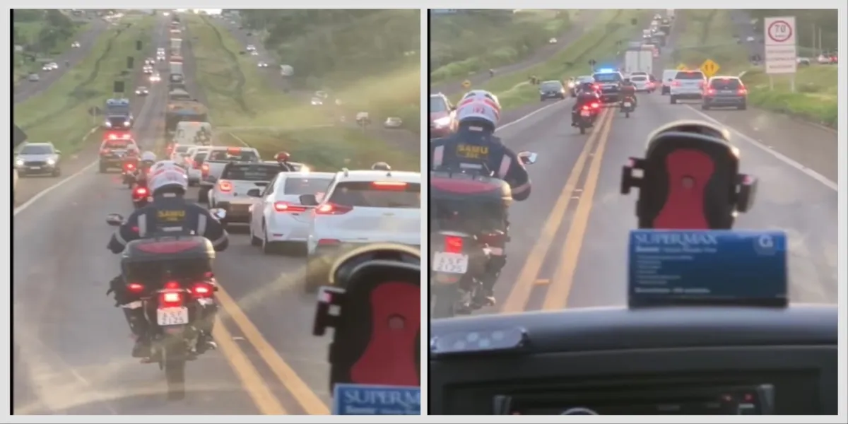 Uma ambulância do SAMU foi escoltada até o Hospital Universitário de Cascavel no fim da tarde de ontem (26) por uma equipe da PRF (Polícia Rodoviária Federal) e motociclistas do SAMU.