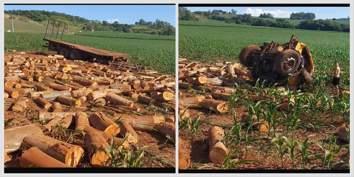 O caminhão, desgovernado, saiu da pista e colidiu violentamente, resultando na destruição total da cabine. A carga de madeira ficou espalhada por uma plantação às margens da estrada.