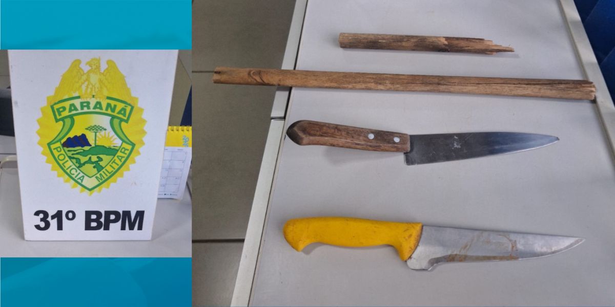 Ao chegar ao local, os policiais encontraram o autor dos fatos portando facas e um bastão de madeira. Durante a verificação, constatou-se que ele possuía uma medida protetiva contra si, porém sem ciência oficial do documento.