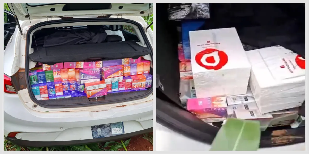 Dentro do carro, os policiais encontraram uma grande quantidade de cigarros eletrônicos, popularmente conhecidos como vapers, além de notebooks. O material caracteriza transporte de mercadoria irregular e foi imediatamente apreendido.