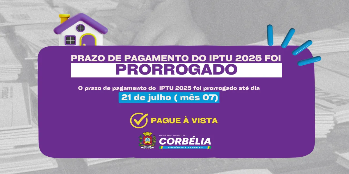 A Prefeitura de Corbélia informa que o prazo para pagamento da cota única e da primeira parcela do IPTU 2025 (Imposto Predial e Territorial Urbano) foi prorrogado para o dia 21 de julho. A medida tem como objetivo oferecer mais comodidade aos contribuintes e ampliar o prazo para quem deseja aproveitar os descontos concedidos para pagamento à vista.