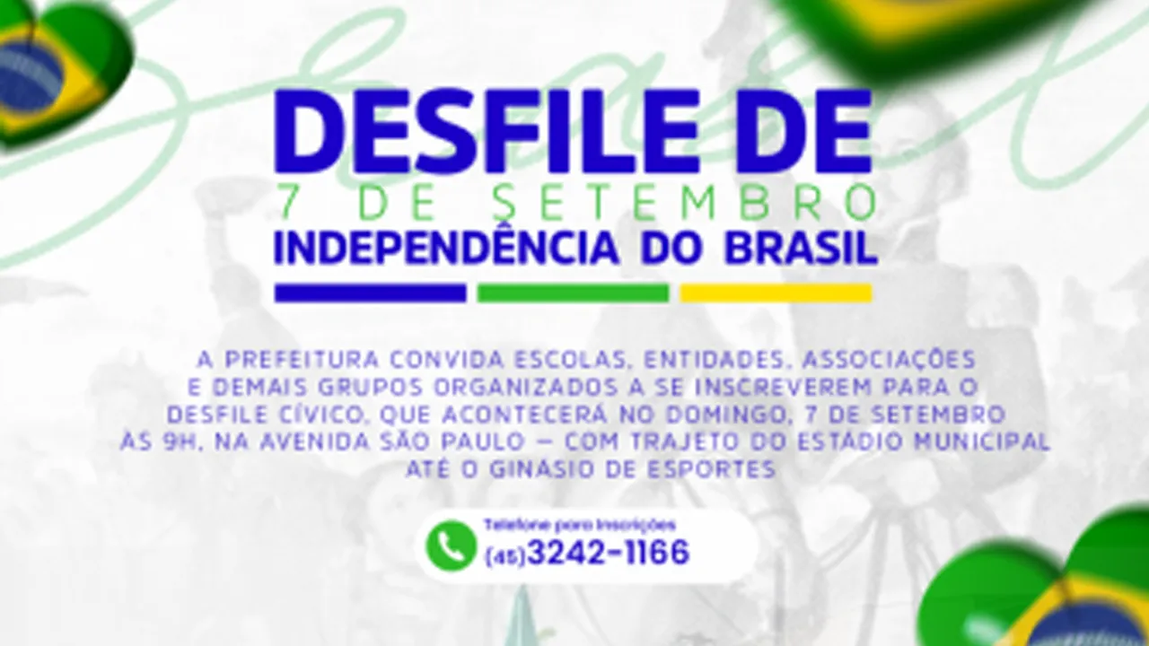 Os grupos interessados em participar do desfile, como escolas, projetos culturais, associações, entidades religiosas ou esportivas, podem entrar em contato até o dia 20 de agosto com a Secretaria de Educação e Cultura para se inscreverem. O atendimento é feito pelo telefone (45) 3242-1166.