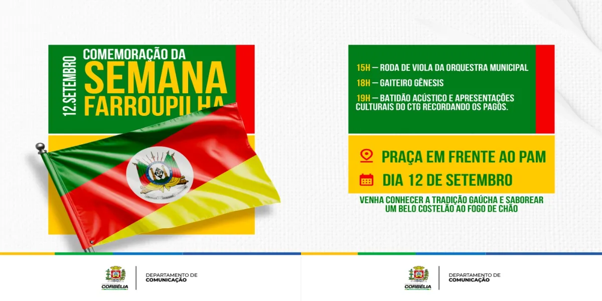 No próximo dia 12 de setembro, Corbélia será palco de uma grande celebração da cultura gaúcha. A tradicional Semana Farroupilha promete transformar a praça em frente ao Pronto Atendimento Municipal (PAM) em um verdadeiro reduto da tradição, com uma programação especial para toda a comunidade.