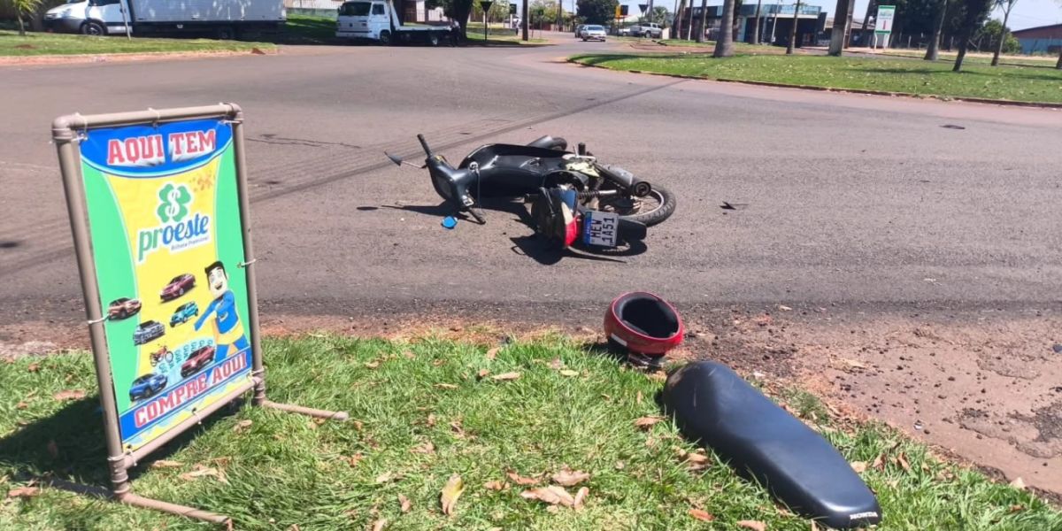 Mulher de moto colidiu com veículo Astra e sofreu ferimentos graves; vítima foi transferida pelo SAMU para o Hospital Universitário de Cascavel