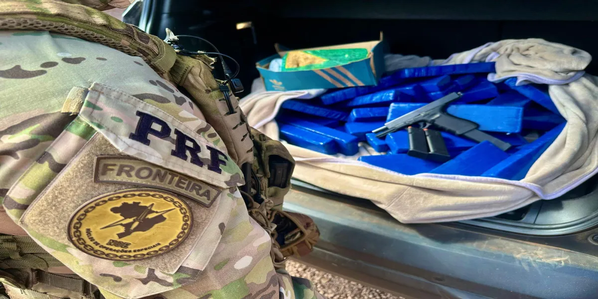 Na vistoria do automóvel, foram encontrados no assoalho e no porta-malas diversos tabletes de pasta base de cocaína e maconha, além de uma pistola Glock G17 equipada com “kit rajada e três carregadores.