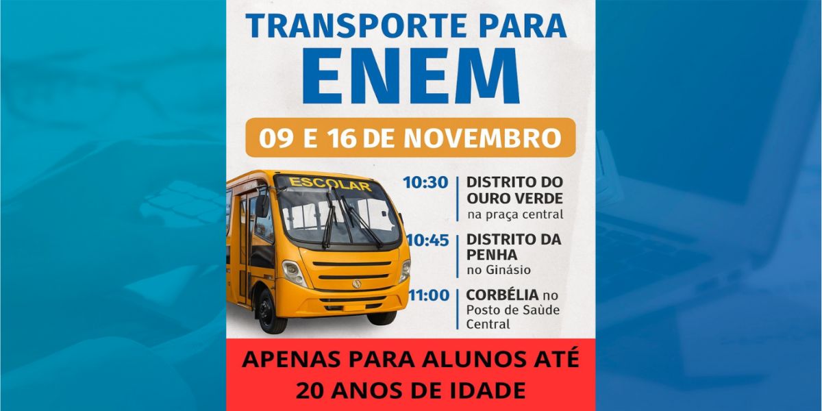 A Prefeitura de Corbélia confirmou que vai disponibilizar transporte gratuito para os estudantes que farão o Exame Nacional do Ensino Médio (ENEM) nos dias 9 e 16 de novembro. A iniciativa garante que todos os jovens tenham acesso ao local de prova com segurança e pontualidade.
