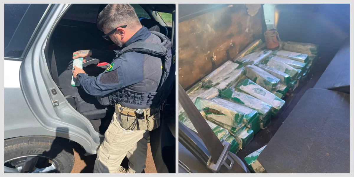 Ao perceberem sinais de alteração estrutural no automóvel, os policiais iniciaram uma vistoria minuciosa. A inspeção revelou um compartimento oculto no porta-malas, onde estavam escondidos 61 quilos de maconha, distribuídos em diversos tabletes.
