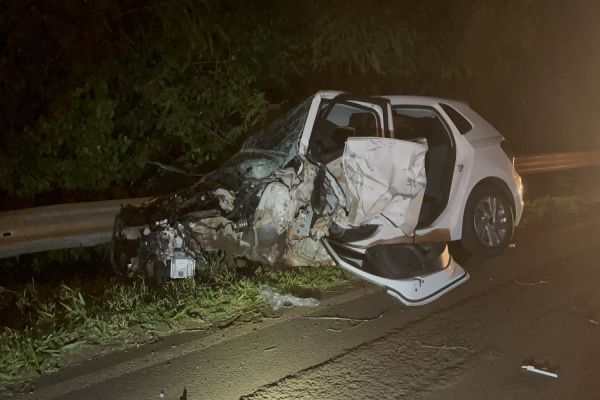 Polo fica totalmente destruído após colidir contra guardrail na BR-369 em Corbélia
