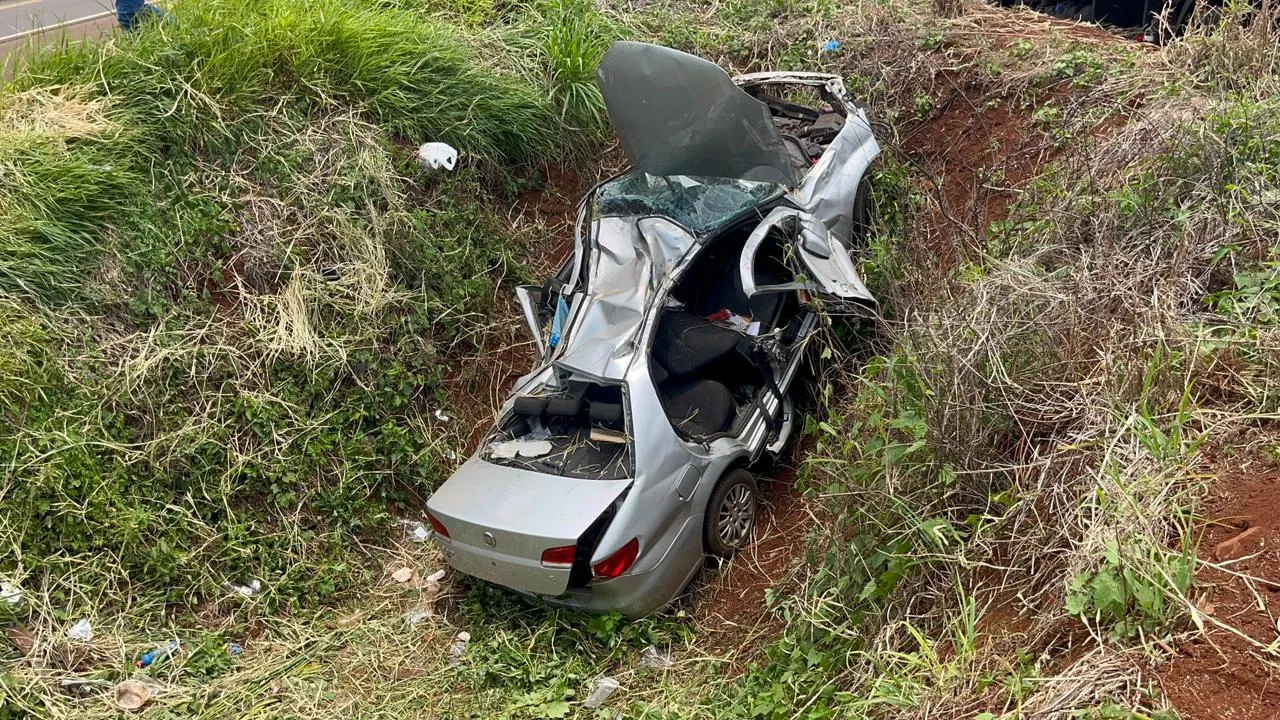 Após saída de pista, Siena colide contra barranco e deixa condutora presa nas ferragens na BR-369 em Corbélia