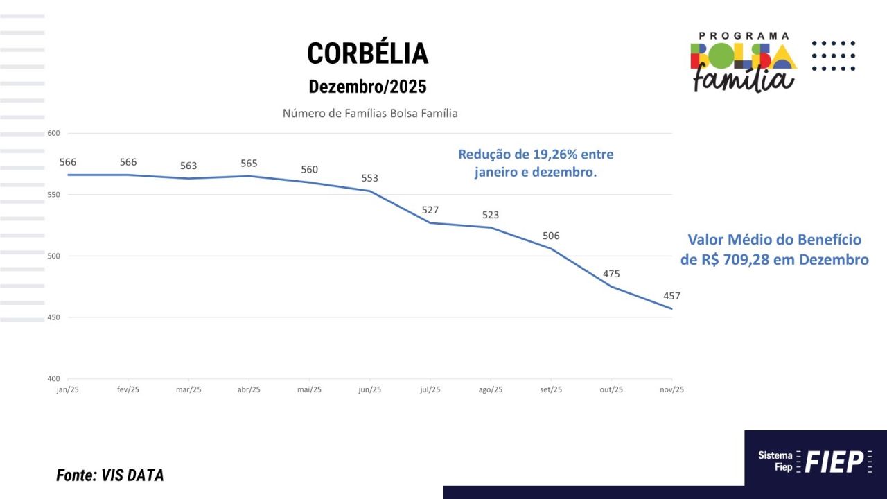 O município de Corbélia registrou em 2025 um resultado expressivo na redução do número de famílias beneficiárias do Programa Bolsa Família, superando com ampla margem a média do estado do Paraná. Conforme dados consolidados entre janeiro e dezembro, Corbélia apresentou uma redução de 19,26%, enquanto o Paraná registrou queda de 9,57% no mesmo período.