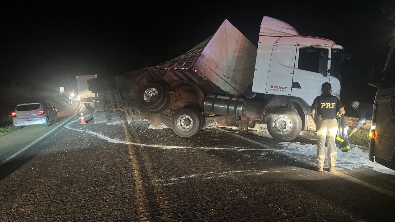 O veículo permanece no local aguardando a chegada de um guincho pesado para a remoção. A pista segue parcialmente interditada, exigindo atenção redobrada dos motoristas que trafegam pelo trecho.
