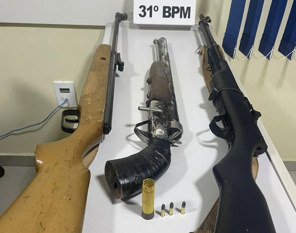 Questionado, o suspeito confessou a autoria do disparo e informou que, ao chegar em casa, teria jogado as armas utilizadas nos fundos da residência, em meio a uma plantação de soja. No local indicado, os policiais localizaram duas espingardas modificadas para calibre .22 e uma garrucha calibre 20 de fabricação caseira.
