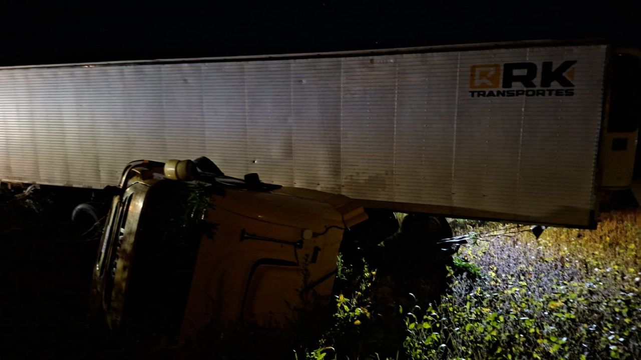 Um tombamento envolvendo uma carreta com baú frigorífico foi registrado no fim da madrugada desta sexta-feira, por volta das 4h, no km 482 da BR-369, em Corbélia.
