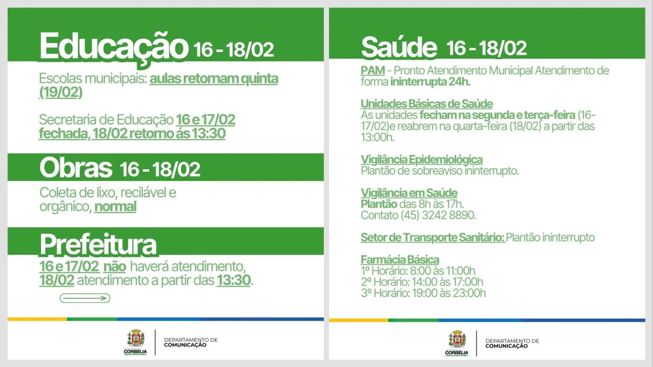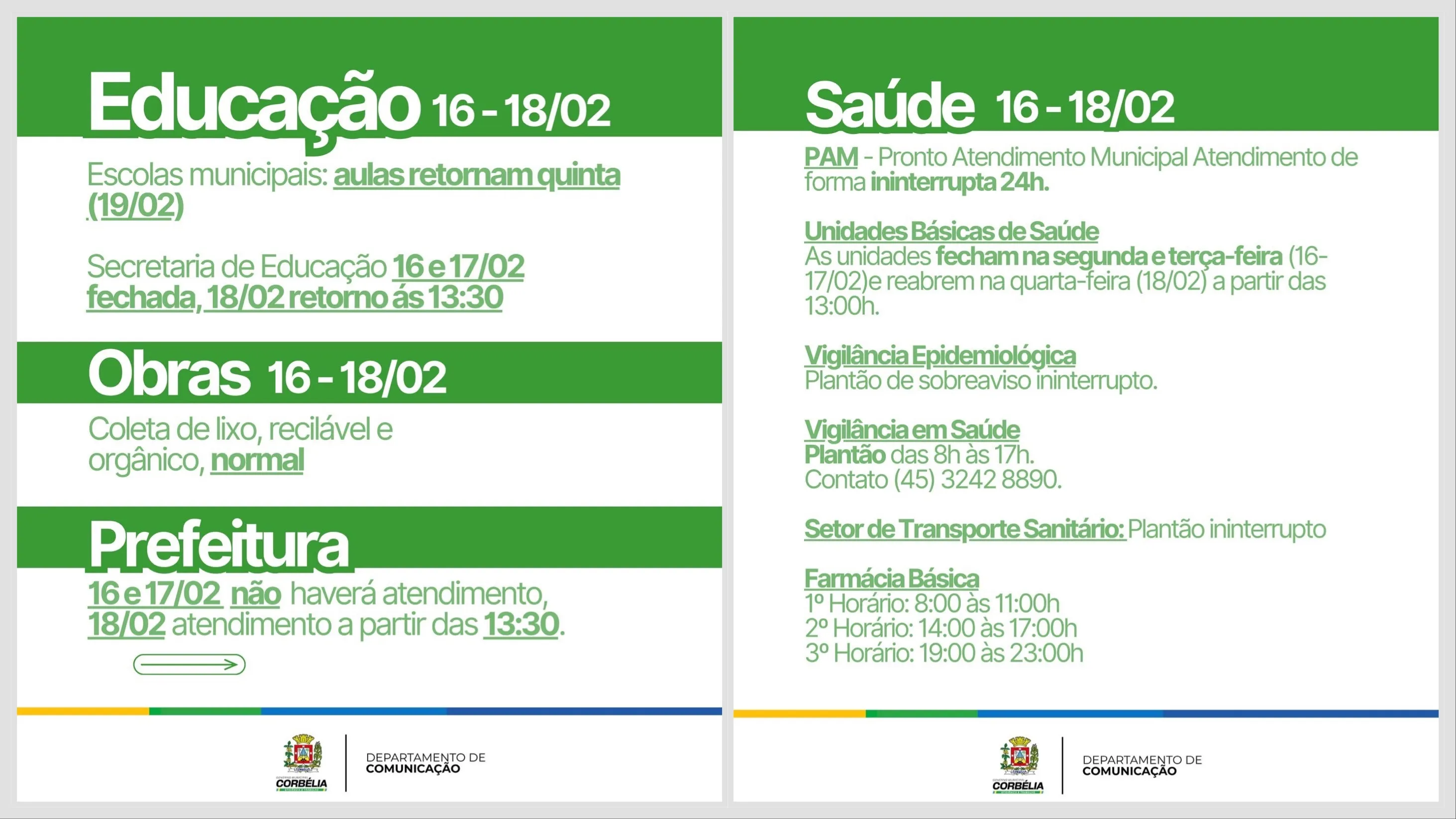 Na Saúde, o Pronto Atendimento Municipal (PAM) manterá atendimento 24 horas ininterrupto. As Unidades Básicas de Saúde (UBSs) estarão fechadas nos dias 16 e 17 e reabrem no dia 18 a partir das 13h. A Vigilância Epidemiológica atuará em regime de sobreaviso, enquanto a Vigilância em Saúde funcionará em plantão das 8h às 17h, com atendimento pelo telefone (45) 3242-8890. O Transporte Sanitário seguirá em plantão ininterrupto.