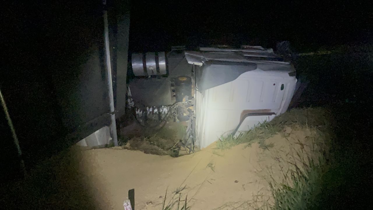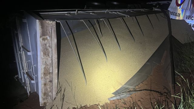 A carreta transportava cerca de 20 toneladas de farelo de soja. Após sair da pista, o veículo atingiu um barranco e sofreu danos significativos na estrutura.
