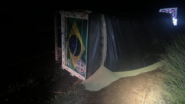 Uma carreta carregada com farelo de soja tombou na noite desta segunda-feira, por volta das 21h30, no km 500 da BR-369, no município de Cascavel.