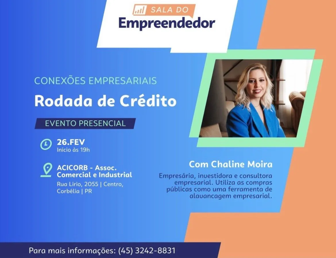 A Sala do Empreendedor de Corbélia promove no próximo dia 26 de fevereiro a Rodada de Crédito – Conexões Empresariais, iniciativa voltada a empresários, microempreendedores individuais (MEIs) e pessoas interessadas em expandir seus negócios no município.