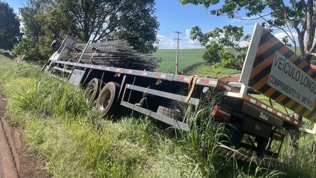 Caminhão sai da pista e fica em situação de risco de tombamento na PR-573