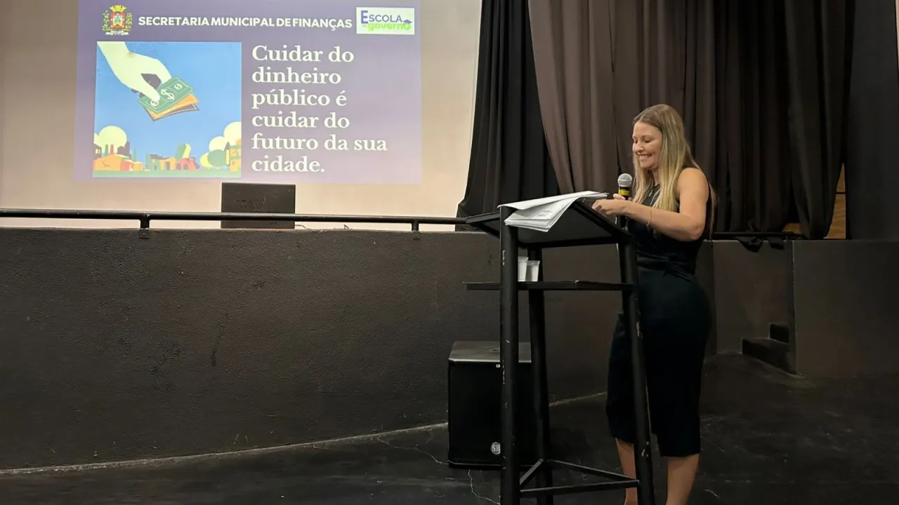 Durante a exposição, Franciele detalhou a estrutura da Secretaria de Finanças, organizada em três departamentos principais: Tributação, Contabilidade e Tesouraria, responsáveis pela gestão dos tributos municipais, pelo controle das contas públicas e pela execução financeira do município.